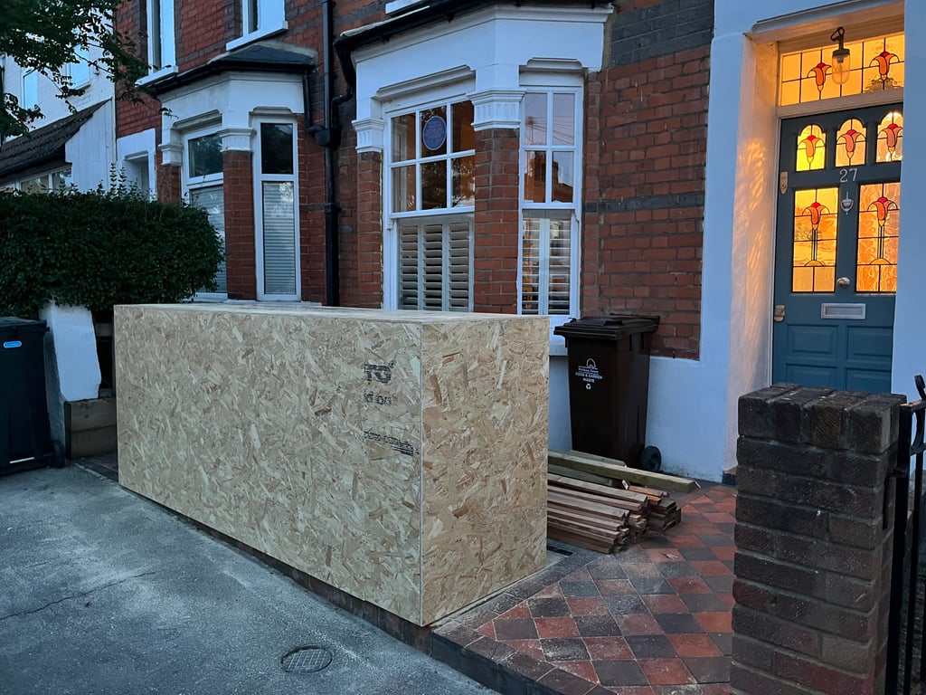 - On Sunday we started construction and have a full box (no doors) framed and clad in OSB, ready to be painted in waterproof paint before we can begin the cladding.